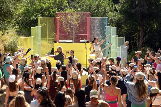 Prior to Sophie Hawley-Weld and Tucker Halpern tackling the bright yellow Beyond Yoga-branded stage with an entire hour-long set chock-full of the hits that put them on the map, guests were first prompted to meet at a specific point in the park. Brand reps then encouraged “hikers” to follow the music, weaving past the lake, a turtle pond, and an installation of gold-tinged disco balls hanging from the trees before ending up at the activation tucked off the main road, where everyone was treated to a much-needed break.