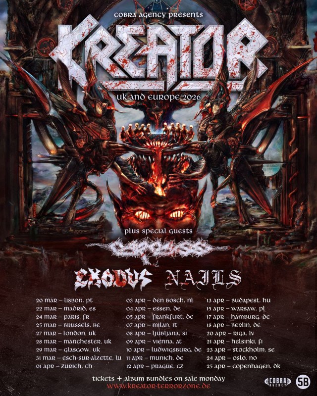 Kreator will be beginning their EU/UK headline tour on March 20 in Lisbon. They will be playing with special guests Carcass, Exodus, and Nails throughout Milan, Berlin, Paris, London, and more before concluding on April 25 in Copenhagen. For the German shows, Nuclear Blast is offering limited-edition album + ticket bundles available here.